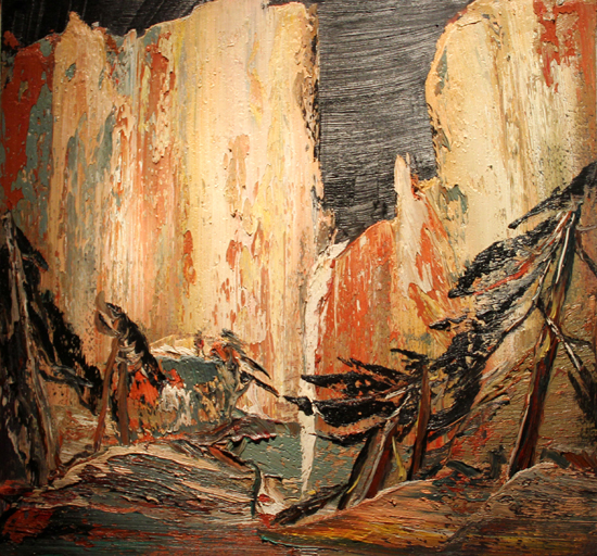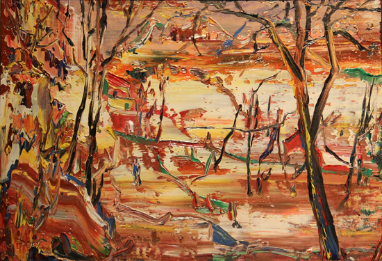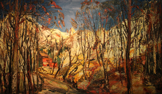 近5年来,尹朝阳无数次往返于嵩山,作品以“太子沟”为中心而展开。“太子沟”是一个游人不太留意的偏僻沟谷,并不特别雄伟、险峻,但巨石横布,疏林峻拔、秀朗,又有红墙古寺掩映期间;春夏秋冬,或毓秀或萧瑟,但却都古意盎然,包含他“嵩山绘画”基本的精神取向:以一个当代中国人的淳朴的心灵经验,与伟大的、但却又是遥远的、迷雾般的“传统”之间深沉的精神对话。