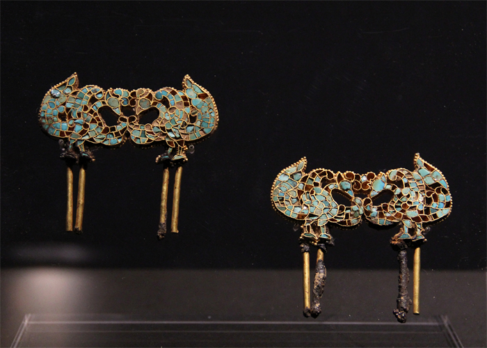 第一部分“金玉辉映”主要介绍金玉合器、嵌错玉石工艺。金玉组合使金铜的光芒毕现与玉石的莹质凝辉相映成趣,从铜与以绿松石为代表的广义玉石的组合,到黄金与以和田玉为主的真玉及宝石的组合,古人的审美经历了从神圣华贵之美到奢侈华丽之美的转变。
