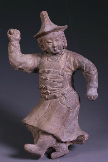 属陪葬品,高40厘米。以泥质灰陶塑成。头戴荷叶笠帽,耳后有双瓣垂髻,身穿方领窄袖长袍,左胯系如意形垂饰,四肢作舞蹈表演状。