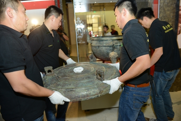 出土于河南上蔡郭庄楚墓的青铜圆盖大鼎鼎盖直径达80厘米,工作人员正小心的搬运摆放。