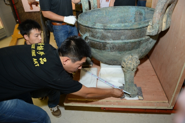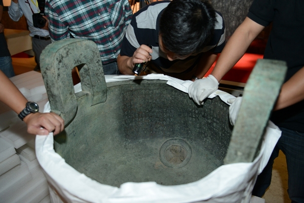来自上海博物馆的大克鼎在工作人员的手下揭开了神秘的面纱。