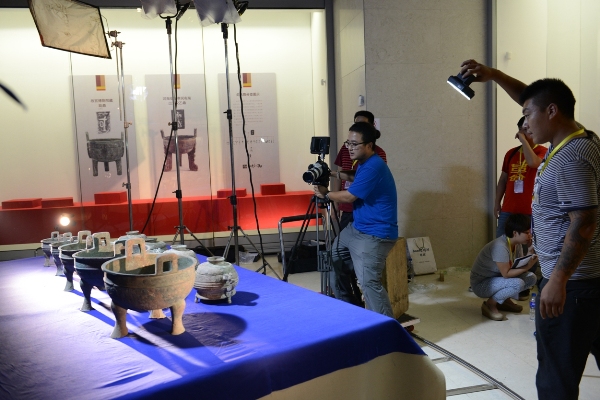 工作人员正在拍摄制作展览宣传片,每个灯光的位置都要充分展示文物之美。