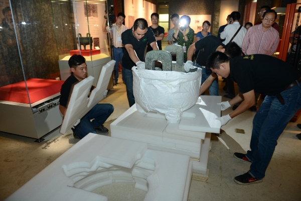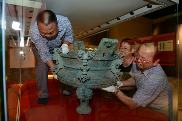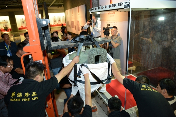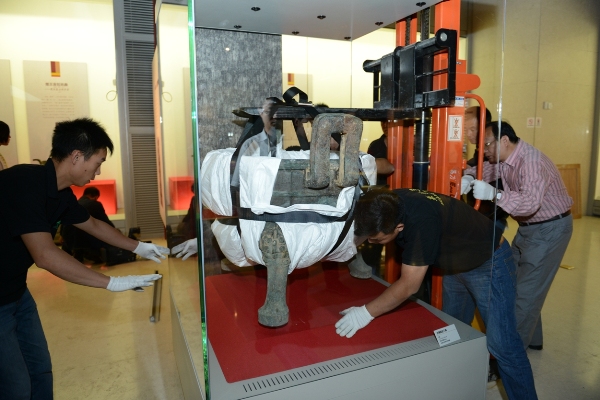 工作人员正在齐心协力地将河南淅川下寺出土的王子午鼎摆放到位。