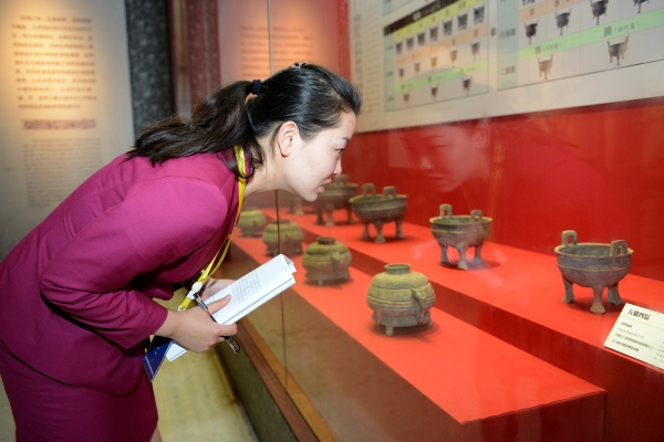 展览开幕前,正在认真的对照文物核对讲词的讲解员显得格外亮丽。