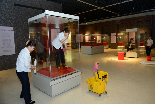 展品布置以前,保洁人员对展柜进行清理。这时,她们是“主角”。