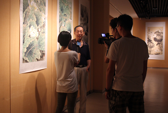 书画爱好者观看展览并接受记者采访