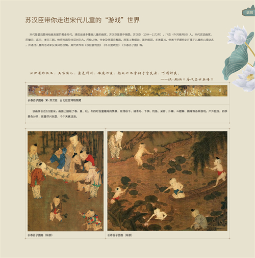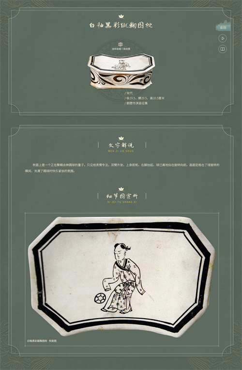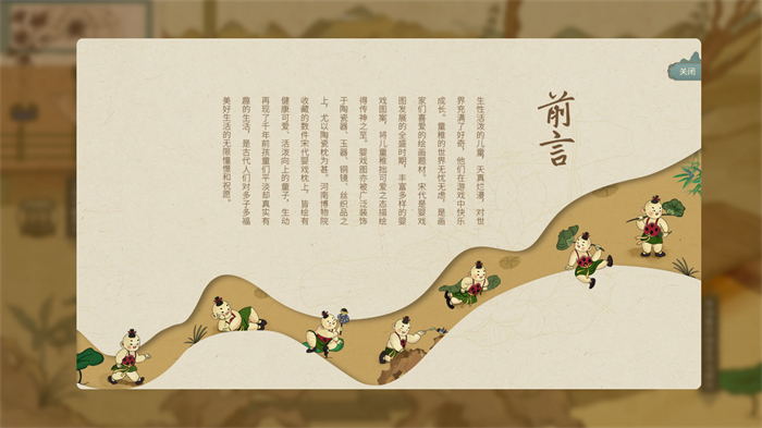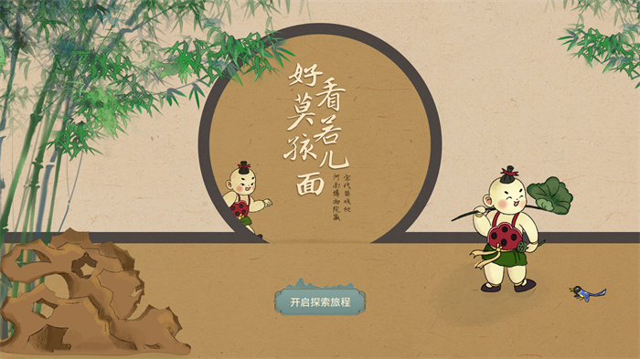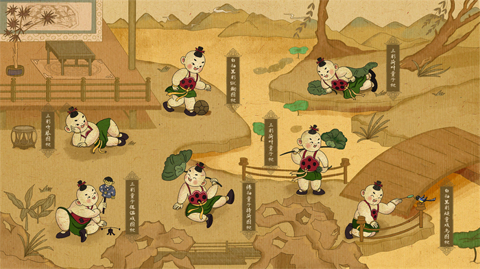 我们通过插画的方式真实还原宋代婴戏图上的孩童形象,将他们的天真烂漫,憨态可掬的神态以动画形式呈现,再配合三维动画、音视频、图文介绍,让宋代婴戏枕上的孩童“活”起来,您只需要用指尖轻点,就可以直观感受人们对多子多福美好生活的无限憧憬和祝愿。