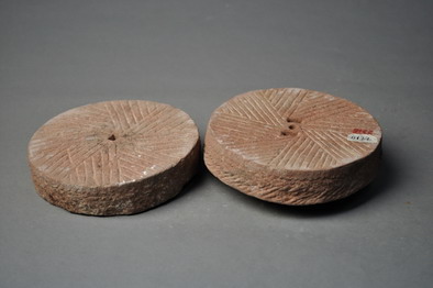 1982年在河南淇县出土一台汉代石磨,分上下两扇,用白砂岩凿成,石质光泽晶莹,白色夹紫。通高19.5厘米、直径55厘米、厚13.5厘米。上扇面凹背凸,背面雕两个半月形漏斗,斗底孔一大一小,大孔径3厘米,小孔径2厘米。扇侧凿一长方形孔,长7厘米、宽3厘米、深5.5厘米,为安装磨棍的槽孔。下扇底平,面微凸,与上扇之底面相配。上下扇磨齿均为八区斜线纹,有使用痕迹。磨脐为铁质圆柱体。⑧