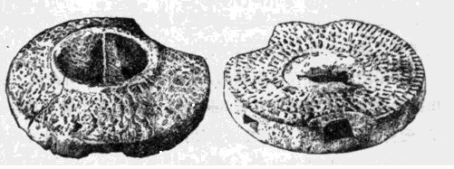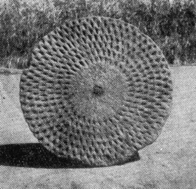 20世纪50年代在洛阳汉河南县城东区遗址中的粮仓里,发现了四扇石磨,其中一件下扇三件上扇,大小相同。其中一件上扇,直径50厘米、边厚7厘米、通高11厘米。顶面隆起,剖面呈凸字形,两个半月形漏斗组成整圆形,漏斗内嵌有铁片,边缘有三个长7厘米、宽2厘米、深6厘米的捉手孔,底面有齿,齿由六匝长方形小坑组成。⑨