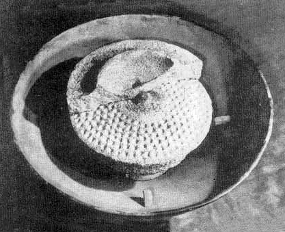 1968年河北满城王陵山中山靖王刘胜墓内,出土了一台完整的石磨,磨置于一个铜制的漏斗之中。分上、下两扇,上扇表面中心作圆形凹槽,周边突起,当中有一道横梁,两侧各有一个长方形孔,底面满布圆窝状磨齿,中心稍内凹,下扇磨齿亦为圆窝状,表面微隆起,中心有一圆柱形铁轴,磨通高18厘米、径54厘米。⑦