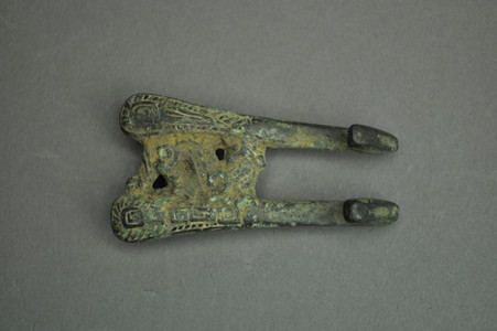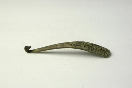 带钩,古称“钩”。束腰带具上的构件,用于束带或佩系。多为铜质、铁质,也有金、银、玉、石等材质。一般由钩首、钩体、钩钮三部分组成,也有个别的异形带钩无钩或无钮。带钩侧视如“S”形,钩钮固定于带具上,钩首用于钩住带具的一端,或用于钩挂器物、佩饰等。带钩造型各异,常见有水禽形、兽形、琵琶形、竹节形等。[2]