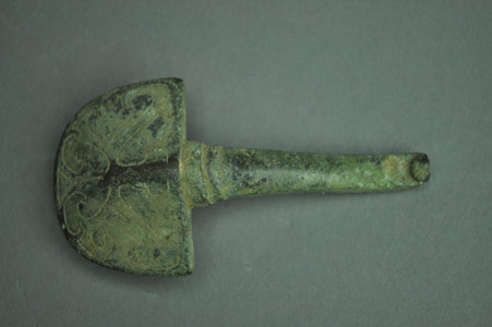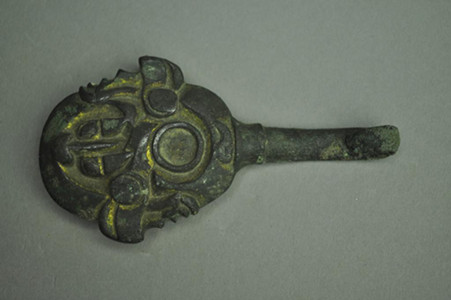 耜形带钩(图15),这件带钩为典形的耜形,远看就像勺子的形状,其钩颈是一支长而直的杆,半圆形钩面上装饰有几何纹,背面则有圆形钩钮。长7.80 厘米,宽4厘米。