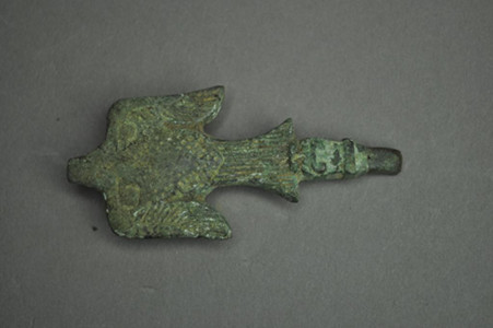 燕形带钩(图10),其外形似展翅飞翔的燕子,双眼及燕尾羽毛铸造的清晰可见,燕尾部被一怪兽紧咬,其背面有圆形钩钮,风格写实,为典型的禽类写真带钩。长7厘米,宽3.60 厘米。