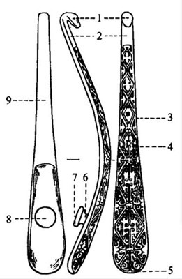 就带钩的形状而言,一端的弯曲处,称作“钩首”,多为鸟兽头形;正面横长部分称为“钩体”,其中间部称作“腰”;另一端背面则有“钩钮”,其下面有钮面。钩首与钩体连接部位被称为“钩颈”,与“钩首”相对应的另一端称作“钩尾”。钩体的正面是钩面,通常装饰有纹饰或铭文。钩体反面的钩背上作有钮,钮由钮柱与钩体相连接。钩钮的表面称钩面,有时也有纹饰。(图5)