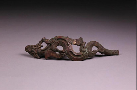 龙形带钩(图11),这件带钩体形较为庞大,作为异形带钩的一种,其钩体呈波浪形状,龙的脊背部铸有沟槽,疑似镶嵌之物丢失或脱落,同时个别的部位还有鎏金的痕迹。长18 厘米,宽4.6厘米。