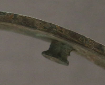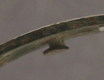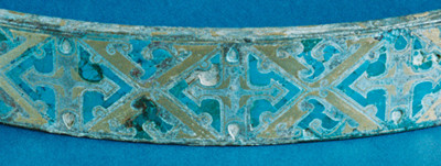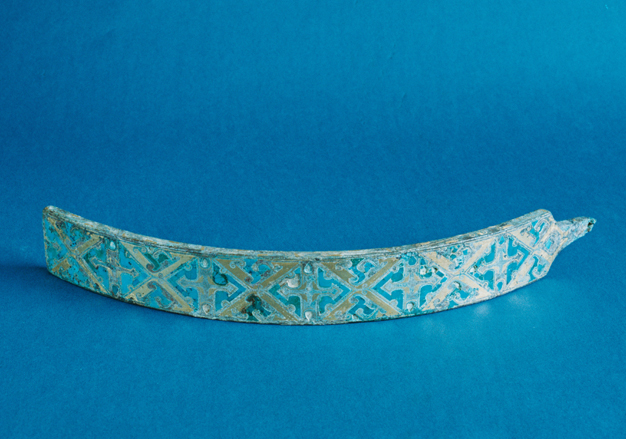 站在美学的角度,整体器物在绿松石和黄金的映衬下,更显奢华与高贵,体现了古人对青铜器装饰别样的审美观念。这种错金镶嵌的装饰工艺,在已发现的青铜器上,可谓是凤毛麟角,同时用绿松石和黄金这些昂贵的材料装饰于一件器物,可见带钩的主人并非寻常百姓,应为当时的王宫贵族们所专属。