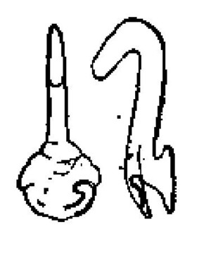 而依据带钩的质料、工艺、造型,大体上可以分为三类:一是从带钩质料上来讲,主要以青铜质料为主,也有用金、银、玉、铁、石、骨、木等质料制成。我们可以将带钩分为金质带钩、银质带钩、铜质带钩、铁质带钩、玉质带钩、石质带钩、骨质带钩、木质带钩等。木质带钩目前考古发现数量极少,其中一件出土于江西贵溪战国早期的越人崖墓里“S”形木器(图7),长22厘米。系用一根木棒前凿一槽后加一柱钮组成;[4]还有极少数的琉璃带钩[5],如广州市东北郊西汉木椁墓出土的琉璃带钩(图8);以及陶制带钩[6];这三种带钩应该只是一种玩赏品。
