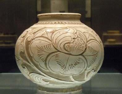 白釉剔花牡丹纹罐,宋代,高12.4厘米,口径10.8厘米,底径7.5厘米。现藏于洛阳博物馆。圆唇,侈口,短束颈,圆鼓腹,圈足。罐腹部剔刻牡丹花及枝叶,颈部剔刻带状锯齿纹,花朵、枝叶上又装饰箅纹。