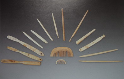 剔、刻、划花工具,宋,现藏于焦作市博物馆。一组15件,皆为骨质,可分为六种类型。一类为扁平形,中间宽厚,两端渐窄。一类为扁平片形,中间宽,两端渐窄,其中一头向上翘起。一类为圆柱形,一端尖圆,有磨损痕迹。一类为方柱型,方形平顶,另一端呈锥状尖锐锋利。一类为扁方形,一端上有一格圆孔,另一端有多个小孔,应为安装鬃毛,清刷剔划花时候残留的碎屑所用。一类为梳子形状,分大、小型,为箅划工具。