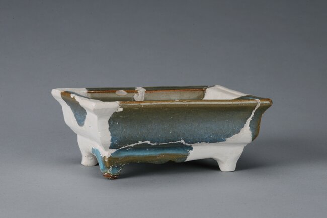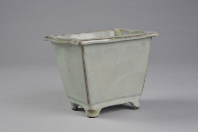 从20世纪70年起,钧窑大的考古发掘有四次,1973-1975年河南省文物工作队对禹州钧台窑遗址进行了发掘,这次发掘出土了除少数的碗、盘等日用生活器皿外,大多是供宫廷和官府摆设需要而生产制作的各式花盆(图4)和盆奁,以及尊、瓶、洗等艺术陈设品,也就是专供宫廷和官府使用的官用钧瓷,发掘人根据发现的大量钧瓷残片堆积和用钧瓷泥制作的并滴有钧釉的“宣和元宝”钱范分析认为:“钧台窑创烧于北宋初期,盛烧于北宋中、晚期”[2]。 由于这次发掘现场文化堆积遭到破坏,加上发掘范围有限,故宫博物院古陶瓷专家冯先铭先生曾针对这次发掘说到“遗憾的是,当时脉络没搞清楚”。随着《禹州钧台窑》考古报告的出版,“宣和元宝”钱范的背面图片也首次披露。由于钱范背面模印有“崇宁年制”四字。众所周知,崇宁为宋徽宗于公元1102年至1106年间使用的年号;而宣和亦为徽宗年号,其启用于公元1119年。这枚背面印有“崇宁年制”的钱范,其钱文年号竟然是晚于崇宁10余年才启用的“宣和”。由于众多学者对把钧台窑遗址定为北宋最重要依据的“宣和元宝”钱范的真实性产生了怀疑,钧官窑瓷器创烧北宋说再次引起争论。为解决钧窑瓷器始烧时间和发展阶段问题,2001年北京大学考古文博学院和河南省文物考古研究所联合对钧窑的一组中心窑场禹州市神垕镇刘家门、河北地、下白峪等窑址进行了主动性考古发掘。这次发掘虽然没有出土专供宫廷和官府使用的官用钧瓷的标本,但揭示了民间所用钧窑瓷器的发展脉络。这次考古发掘表明,刘家门瓷窑在北宋末期的宋徽宗和宋钦宗时期(公元1101-1127年)烧制出钧窑瓷器,“但钧窑瓷器釉层较薄,釉的流动性不强,釉色淡雅匀净,部分器物布满小块开片。口部和器物转折处等釉薄处呈赭绿色,在器体部釉稍薄处则呈现出淡淡的粉红色。”与同期的青釉器一样“器物在未施釉部位,如足底部加施一层酱褐色护胎釉。大部分碗、盘类产品均施釉至足底,并在足心内施釉。”[3]这应属钧窑瓷器创烧阶段。2004年为配合禹州市“古钧花园”(原禹州制药厂)建设,河南省文物考古研究所对“古钧花园”窑址进行了抢救性考古发掘。这次发掘发现有窑炉、灰坑、水井、房基灰沟等遗迹。出土遗物以瓷器为主,有钧釉瓷、豆青釉瓷、黑釉瓷、黄釉瓷、孔雀蓝釉瓷、白釉瓷和宋三彩。其中其它釉色出土多为罐、盏、执壶、壶、杯、盒、枕、儿童玩具等。钧窑瓷器主要有出戟尊(图5)、鼓钉洗、高柄碗、单把洗、花盆(图6)、盆托、盘、钵、碗等。在花盆、出戟尊等器物底部刻 有“二”“三”“四”“五”“六”“七”“八”“九”等数字。专家通过对2004年和1974年两次出土钧瓷进行了细致的对比,发现2004年出土的钧窑瓷器中的出戟尊、鼓钉洗、花盆、盆托等器形较大,工艺、胎质、釉色与1974年出土的同类器均有所不同,与这批钧窑瓷器同一灰坑出土的还有具有明显元代器物特征的孔雀蓝釉碗、盆、高足碗和钧窑高足碗等,无疑为这批钧窑瓷器的制作年代提供了旁证,其时代应为元代。至于许多民间所用钧窑瓷盆、盘、洗和碗所在灰坑,由于打破的两个灰坑内分别出土的白瓷碗的碗底和外侧均有墨书“正隆元年四月初”和“正隆元年三月初五日”等纪年字款,因此可知灰坑瓷器不会早于正隆元年(公元1156年)[4],应属金代中早期。