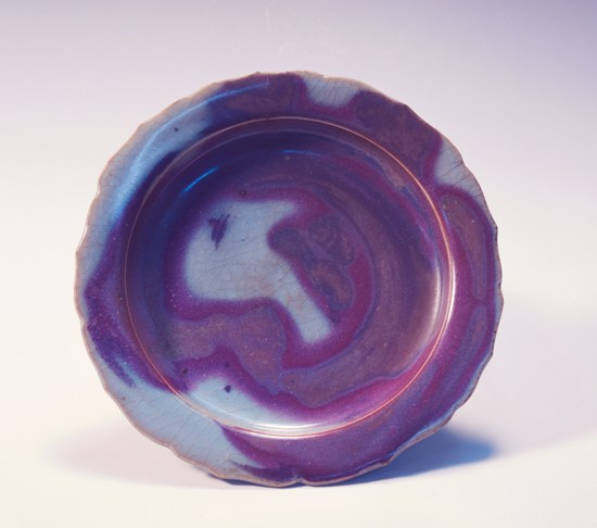 图1    金代钧窑天兰釉玫瑰紫彩斑葵花盘