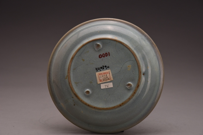 1925年11月鄢陵县城内居民魏书成在院内挖红薯窖时发现金代窖藏瓷器数十件,后卖给开封古玩商,12月本县知事张聚奎将此事呈报河南教育厅,教育厅令河南图书馆馆长何日章追查,后以704元赎回这批瓷器,先由图书馆保存,后经古物保存委员会移交河南博物馆收藏。1937年“七七事变”爆发后,河南博物馆主要馆藏文物68箱运往重庆,除38箱被运到台湾收藏于台北历史博物馆外,其余30箱后来回归河南博物馆。这件金代钧窑天兰釉瓷盘就属鄢陵金代窖藏出土和河南博物馆南迁瓷器之列。