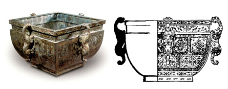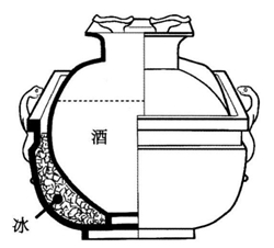 方鉴与方罍配套使用,罍置于鉴内,其间空处置冰,炎炎夏日之中,起到冰镇酒醴的作用(图四)。试想在电冰箱还未发明的古代,满盛一罍酒水,置于放满冰块的冰鉴之中,凉气渐渐沁入酒中,炎热之际,取一勺饮,何等惬意。《楚辞·招魂》有“挫糟冻饮,酎清凉兮”之句,描绘了盛夏时节,楚国贵族喝冰镇醇酒的情景。