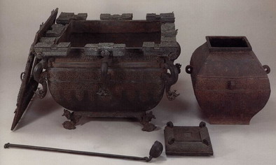 这套器物是由一个方鉴和一件方尊缶组成的青铜套器,底部一侧设两个长方形榫眼,另一侧设一个长方形榫眼,榫眼可与方鉴内底三个弯钩扣合,其中一个弯钩的活动倒钩自动倒下后,可把方尊缶固定在方鉴里而不晃动,制作十分巧妙。方鉴有盖,方形,盖面中空,恰好可容方缶颈部。缶盖隆起,四角附竖环形钮,盖沿内折,并有与器口扣接的子母榫,与器身扣合严密。与青铜冰鉴配套的还有一把长柄青铜勺,勺的长度足以探到尊缶内底。