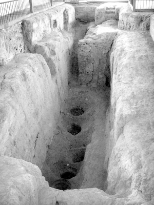 先秦时期的凌阴遗址,在新郑郑韩故城遗址的宫殿区西北部曾有发现(图七)。其遗迹口略大于底,上口南北长8.9米,东西宽2.9米,四壁分层夯筑,它的东南角挖有一条宽0.56-1.15米的台阶式走道,以出入地下室。室内近底部的墙壁上,断断续续涂着一层草拌泥,西南角和北壁的草拌泥面上,粘贴一些背面带凹槽的方砖,应是室内墙壁原来贴有砖面的遗留。在室底西侧的地面上,也发现两块背面带凹槽的方砖,应是室内铺地砖。特别是在室内底部的偏东侧,发现了南北成行的五眼井,约占室内地面的1/3。五眼井以陶井圈逐层叠筑而成,井圈直径0.76-0.98米,井口与井口距0.30-0.65米。地下室口部周围的地面上,还发现一些圆形残柱洞,应是支撑房顶建筑设施的柱洞遗留[6]。年代早于郑韩故城凌阴遗址的还有陕西雍城姚家岗宫殿遗址西部的春秋时期凌阴遗址,以及安阳殷墟大司空遗址内发现的商代凌阴遗址。商代凌阴是在一个深达2、3米的窖穴底部再下挖的一个长方形坑,坑深达6米多,坑底温度较地面低6-10℃。秦都雍城凌阴遗址则是东西长10米、南北宽11.4米的近方形窖穴,窖内四壁呈斜坡状。窖壁上部夯筑,下部为生土。相较之下,郑韩故城凌阴遗址则显得较为先进。“该遗址室内发现的背面带凹槽的方砖,及室内底部东侧发现的南北成行的五眼井,起码说明韩人在处理冰块融化后的排水问题上比秦人高明。一是地下铺以背带凹槽的方砖,冰水可以顺槽而流,即使是压在底部的冰块也不致因室底有少量积水而浸泡在水里。二是室内置井,冰水可就地入井自渗。不仅在建筑时节省了人力物力,而且在实际过程中,冰水就地入井自渗,还可以抑制地下温度的上升。”[7]