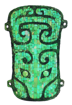 铜鉴与铜罍通身都应用了青铜嵌错工艺,一般是在器物表面预留纹饰槽,或待铸出后錾刻出纹饰槽,分别嵌入金、银、红铜等较软的金属丝或玉、绿松石、漆等,并加以错磨,使之表面平整。纹饰与器物间因不同材质而呈现出交相辉映的效果。嵌错工艺从夏代开始就已经出现,多是玉石嵌错于铜器上,如二里头遗址出土的嵌绿松石兽面纹铜牌饰(图三)。到了商代,又出现在铜器上填漆的做法,如在信阳罗山县莽张乡商代晚期的息国墓地出土的青铜鼎上(M5与M6所出)就发现用黑漆填饰[2]。而这种填漆方式至春秋战国时期的辉县琉璃阁墓地出土器物中还有使用。春秋中晚期以来,铜容器上多使用错金银或者红铜的工艺,至战国时期而尤为兴盛,不仅适用器物多样化,镶嵌和错金用料也更多样化,同时,还出现一些造型灵巧、花纹工整的器物。上村岭出土的铜鉴采用金丝盘填嵌于空隙内,金丝盘嵌整齐,器表磨错平整光亮,足以代表战国时代错金镶嵌工艺的新成就。铜罍器身光亮的黑漆,不仅增加了纹饰及色彩的对比度,更具观赏性,而且还具有防锈蚀的作用。