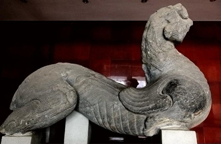 石天禄, 1954年洛阳市涧西孙旗屯乡出土,为东汉时期器物,出土时为一对,另一件现存于洛阳关林管理处的石刻艺术馆。头部高扬,大嘴怒张,露出牙齿,鼻孔圆大,眼睛像两个大铜铃,直视前方,整个躯干似虎,身长,腰细,臀宽,四足如狮。这件辟邪背颈部有阴刻隶书“缑氏蒿聚成奴作”7个字,缑氏是汉代的县名,当时属洛阳京畿之地,也就是现在的偃师市缑氏镇。从这7个字可以看出,作者成奴是偃师缑氏人。通高122、通长165厘米。现藏于中国国家博物馆(图6)。