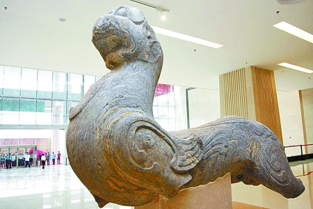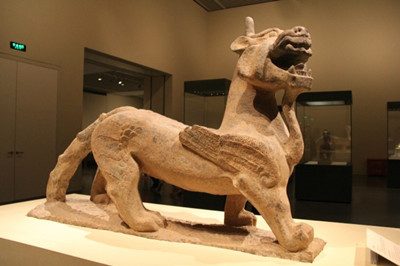2005年8月,许昌市襄阳县颍阳镇出土一尊汉代有翼石天禄,现藏于许昌市博物馆。天禄四脚、尾部和头部都残损,长2.8米,宽1.1米,雄性,昂首挺胸,张口,长舌(或须,由于残损,舌、须特征不明显)贴胸,一角残损,但有明显的痕迹,双翼生于两前脚近肩部,翼尾向后翘起,其他羽毛为浅浮雕。(图3)