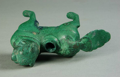 天禄昂首挺胸呈站立状,两耳下垂,两眼珠外突,大鼻,张口吐舌(图1),宽尾下拖,兽足,头部和尾部可见阴刻细线纹饰做毛发,宽尾下拖,且背部有一柱状圆孔与腹腔相通(图2)。通体呈孔雀绿色,如同一层绿色油漆,金属光泽度好。该器物的造型生动,构思新颖,铸造工艺精湛,不仅是一件实用物又是一件造型优美的工艺品,是古代青铜器中的精品。