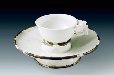 2.浙江临安晚唐水邱氏墓出土的白瓷带把杯茶托,口径8.2厘米,托径16.6厘米,中央为凸起的圆形托座,座面边沿凸起,可以防止杯子倾倒。