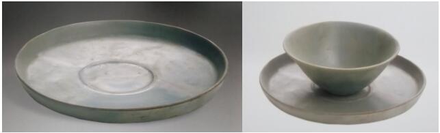 5.清凉寺汝窑出土北宋圆盘形盏托,高5.8厘米、托径8厘米、盘径16.3厘米、圈足径7.6厘米。圆盘式托盘上起一碗,下部接较矮的外撇圈足。