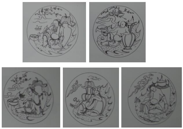 第一人(线图一)束发包巾,袒胸露肚,手执酒杯,背靠酒瓮,旁边置酒樽,樽中有勺。第二人(线图二)上身裸露,斜靠酒瓮,身旁有樽、勺,右手执酒盏,酒盏倒置,似饮至半酣。第三人(线图三)束发包巾,单衫半褪,肩膀半露,身后有荷叶盖酒瓮,身旁有樽、勺、杯。第四人(线图四)仰头斜靠酒瓮,袒胸露肚,身旁一高足杯斜置,酣睡状。第五人(线图五)低头颔首,单衫半褪,袒胸露肚,背靠酒瓮,身旁一酒盏斜置,樽、勺倾翻于地,酣睡状。这五幅图案,皆描绘了饮酒时的场景。酒盛在大瓮之中,饮时先将酒倒入酒樽,再用勺将酒酌于酒盏或高足杯中。或描绘饮酒时场景,或描绘饮罢时的状态,或描绘酒至半酣、醉态酣然的状态。把饮酒的图案錾刻在银器上,并且器物上锤刻“陈官人宅用”,这无疑表明了盏及盏托是“陈官人在家宅所用”的饮酒之具。