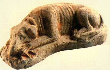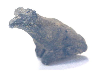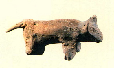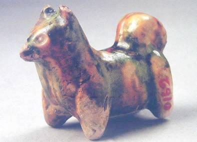 1960年河南省临汝大张出土的龙山文化时期的黑陶狗(图二),高4.5厘米。泥质黑陶,捏塑而成。狗呈蹲卧姿,昂首竖耳,吻前伸,前肢屈伏于地,后肢缩屈于臀下。这件陶狗是中原地区出土较早的陶塑动物之一,反映了龙山时代家畜饲养业的发展状况。
