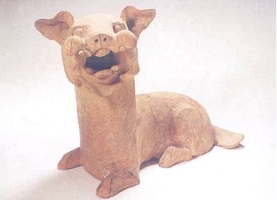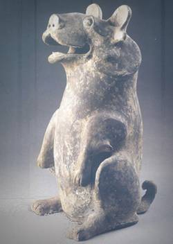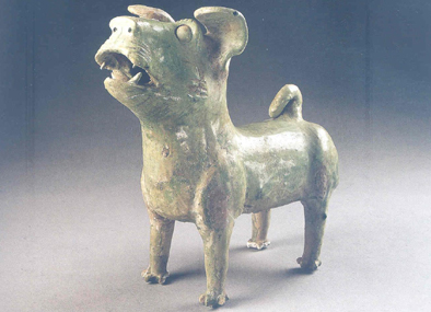 夏、商、周三代,是中国历史上的青铜文明时代,青铜艺术作品丰富多彩,精美程度令人叹为观止。在这种大背景下,陶器的烧造并没有销声匿迹,而是与青铜铸造业得以并行发展。此时的陶狗造型大多还是陶器皿的附属物,捏制手法朴拙,但能够抓住对象的基本特征与动态,反映了先民的观察力与创造力。商代的雕塑艺术,大多富于神秘、威慑的色彩,表现的是神化了的人与兽,狗的形象在此时也被吸收进了神兽形象的塑造之中。春秋战国以后,随着人殉制的废止,陶塑人物和动物的功能开始发生转变,替代活人和动物随葬的功能被开发出来,并得以广泛流行,直接推动了中国封建时代陶塑艺术的进步。