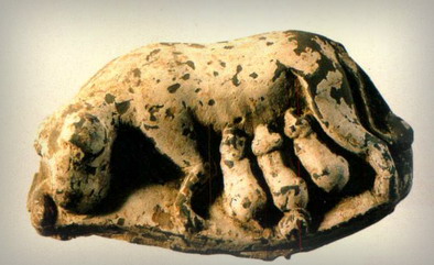 1975年安阳张家村和绍隆夫妇合葬墓出土的北齐哺乳陶狗(图九),河南省文物考古研究所藏,长15厘米。泥质灰陶,模制,中空。通体以白粉为底,再施以彩绘, 出土时已经大部脱落。母狗眯眼,大耳,长尾,头部伏地,侧卧,作哺乳状, 腹下有三只幼犬作吃奶状。[7]