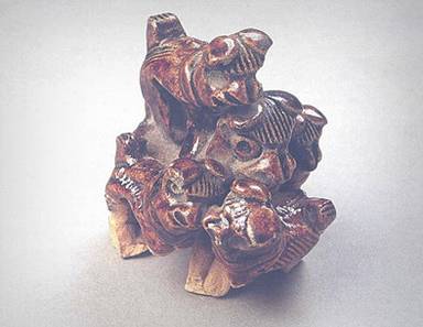 宋代黄釉陶群狗(图十三),高7.3厘米,泥质橙黄陶,由捏塑和模制而成。五条狗一大四小均为昂首弓背,双耳前伏,短尾上卷,通体施黄釉,作追逐嬉戏状。