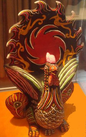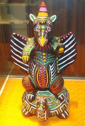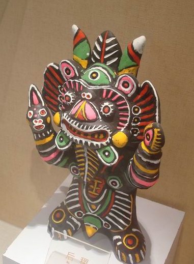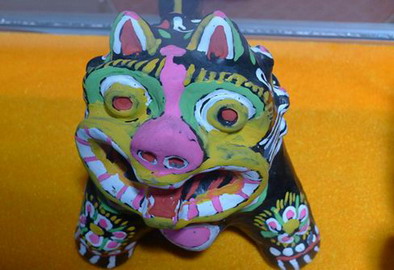 淮阳“泥泥狗”为胶泥捏制而成,造型古拙、怪诞,色彩艳丽,以黑色垫底,用大红、黄、白、绿、桃红五色点画出由圆弧曲线、直线和点组成的各种图案,线条稚拙而生动,色彩绚丽又不失沉稳,有楚漆器文化的格调。其题材包罗鸟、兽、鱼、虫与人物,品种有数百种,诸如“人面猴”、“人面兽”、“猴头燕”、“九头鸟”、“两头狗”、“多头怪”等。有孔可吹奏,声音悠远明亮。