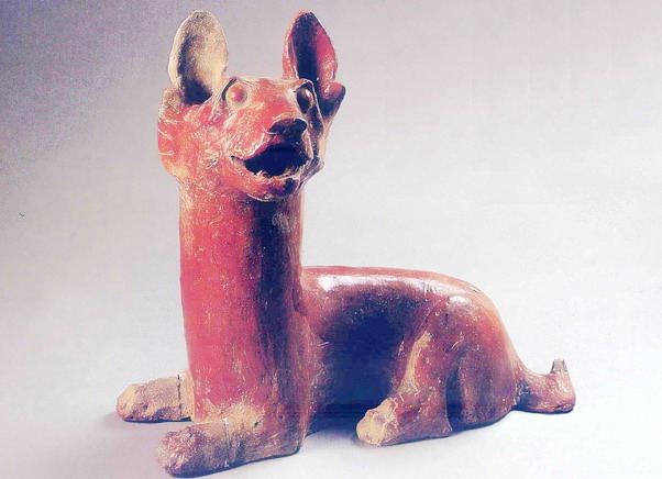 河南南阳出土的东汉卧姿红陶狗(图五),高42.5厘米,长50厘米。泥质红陶,由模制和捏塑而成。狗昂首怒目,卷耳,张口狂吠,四肢和尾伏地,呈左卧姿态,体魄肥壮,栩栩如生。