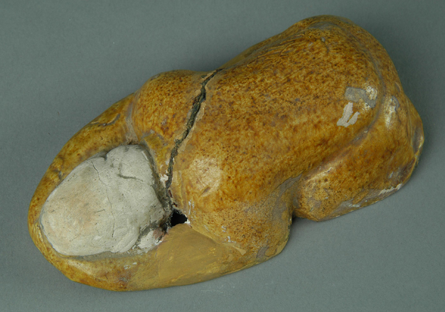 黄釉匍匐俑,唐代,陶器,高3.9厘米,长13.7厘米,宽7.7厘米。洛阳偃师关窑村唐墓出土,现藏于洛阳博物馆。[1]
