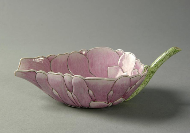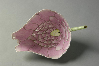 荷花吸杯整体造型如盛开的荷花,一侧吸管造型如荷梗。杯口圆唇外敞,杯口呈花瓣形,腹部下收,平底。底部一侧有小圆孔,与荷梗相通。荷梗较细,中通,随杯体曲弧向上。荷梗既为杯柄,又为吸管,吸酒以饮,颇具雅趣。