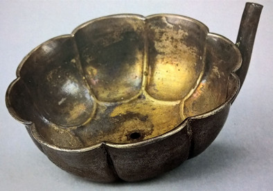 一、何家村出土唐代鎏金银质荷叶吸杯。高1.5厘米,口径3.5厘米,重73.5克。1970年西安市南郊何家村窖藏出土。现藏陕西历史博物馆。造型独特,花形口,器身为八曲,整体呈花苞形。底心有孔,外接焊一弯管,由体外高过器口,上端齐平。据孟晖考证,[6]这是一件珍贵的“荷叶吸杯”,或称“荷杯”“碧筒杯”“碧筒劝”。徐珂《清稗类钞》“物品类”中解释甚详:“吸杯,做莲蓬、莲叶交互相连状,别有莲茎,茎之中有孔,可吸饮。”这件荷叶吸杯就是将天然的荷叶吸杯予以工艺化的再现。