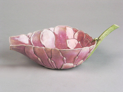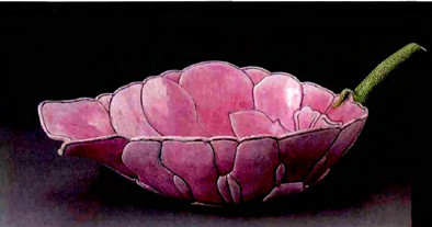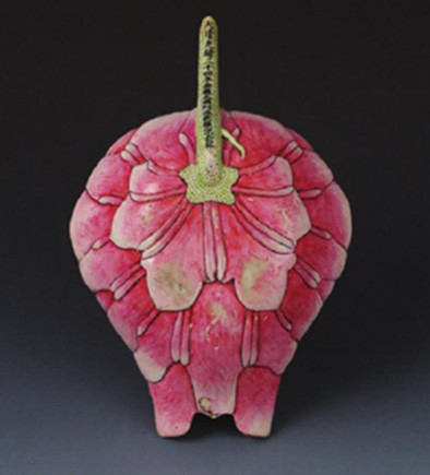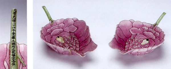 粉色花瓣整体为船形,花瓣勾勒有脉线,杯内地有一孔通过细长的梗引到上面,作为吸管。梗背面墨字“大清光緒三十四年安徽太湖附近秋操記念杯”[7]