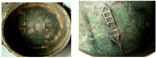 图一 器底网格纹   图二 器盖内铭文
