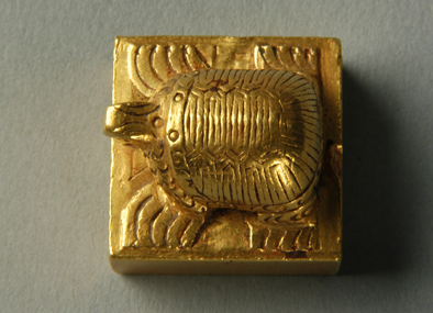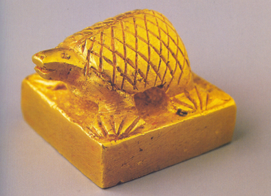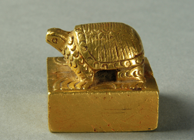 1956年,湖北省云梦县春光出土东汉时期的金“关内侯印”(图五),通高2.2厘米,印面2.4 X 2.4厘米,湖北省博物馆藏。该枚金印的龟纽部分呈俯伏状,龟首伸昂,龟背平而略长,龟甲上凿刻直线纹、曲尺纹和圆圈纹。