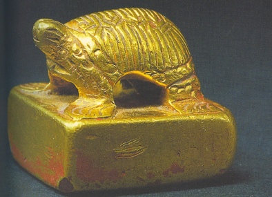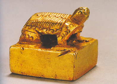 1957年,湖南省长沙陈家大山20号墓出土一枚西晋时期的金“关中侯印”(图三),通高2.1厘米,印面2.4 X 2.4厘米,重125克,湖南省博物馆藏。该印的方形印座上有一龟形纽,龟首上扬,龟口微张,龟背甲上阴刻简洁明了的菱格纹,龟四足坚强有力,刻划清晰有力,印面白文篆书“关中侯印”四字。