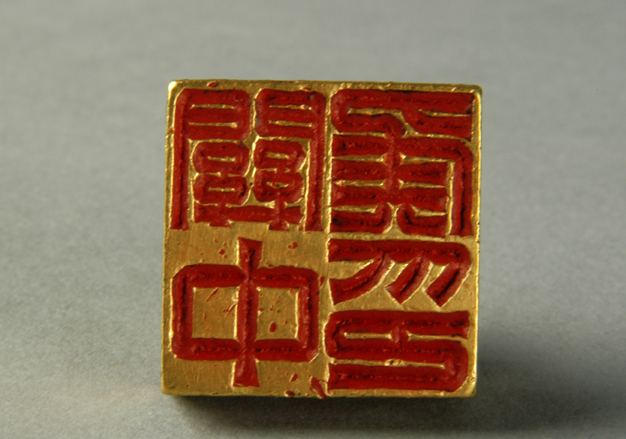 关中侯印,金质,东汉文物,通高2.2厘米,印面2.4 X 2.4厘米,重128克。印面为正方形,阴文篆刻“关中侯印”四字。1951年河南省南阳县石桥镇出土。